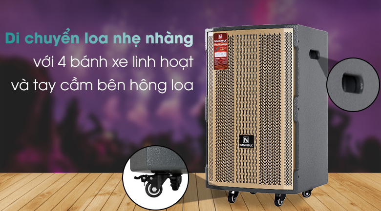 Với tay cầm và 4 bánh xe bạn có thể dễ dàng di chuyển chiếc loa kéo này đi khắp nơi, khi muốn cố định chiếc loa kéo Nanomax này bạn chỉ cần khóa chốt ở bánh xe giúp loa không trượt khỏi vị trí mà bạn muốn để.