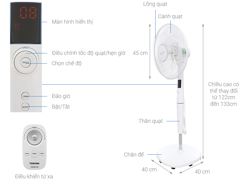 Quạt Toshiba có các chế độ gió thường, gió tự nhiên và gió ngủ thổi êm ái, nhẹ nhàng giúp bạn dễ chịu hơn. Quạt kèm remote điều khiển từ xa tiện dụng, có thể điều khiển mà không cần lại gần.
