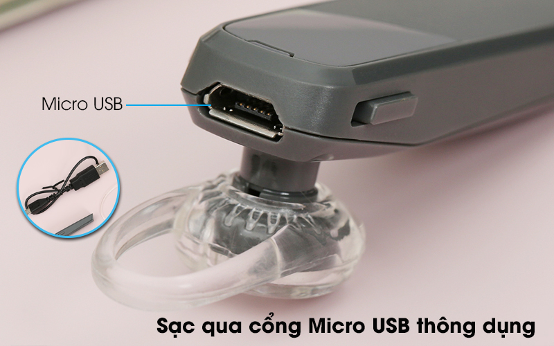 Tai nghe Plantronics trang bị cổng Micro USB, khi thiết bị sắp hết pin, nạp pin nhanh cùng cáp sạc tặng kèm.