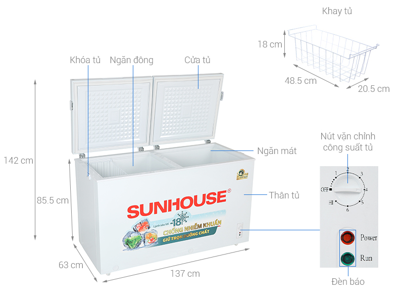 Tủ đông Sunhouse 330 lít SHR-F2472W2 được thiết kế với 2 ngăn với ngăn mát (0 đến 10 độ C), ngăn đông (- 18 độ C) cùng 5 mức điều chỉnh nhiệt độ linh hoạt giúp chống nhiễm khuẩn, bảo quản thực phẩm tốt hơn.